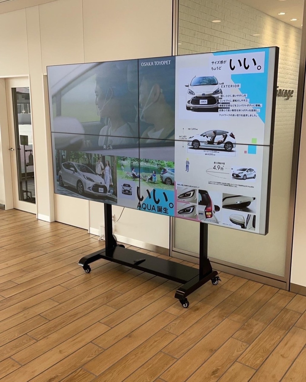 入口に大迫力の4枚組み合わせモニターが出迎えています。